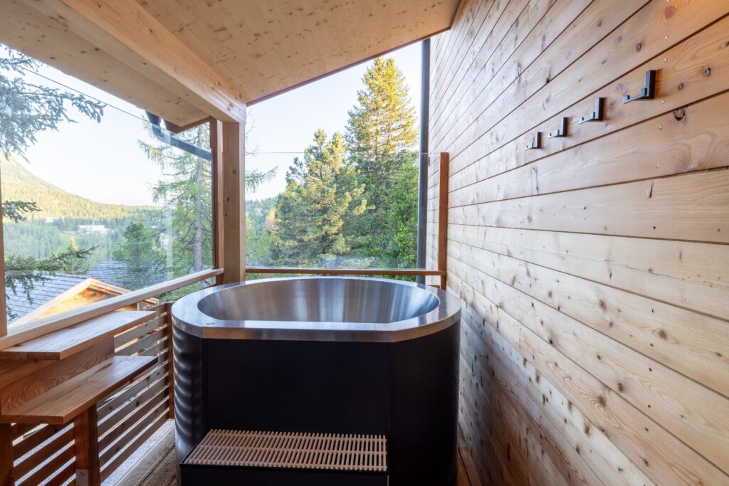 - Soukromou vířivku a sud pro relaxaci s panoramatickým výhledem na hory a lesy a aromaterapií